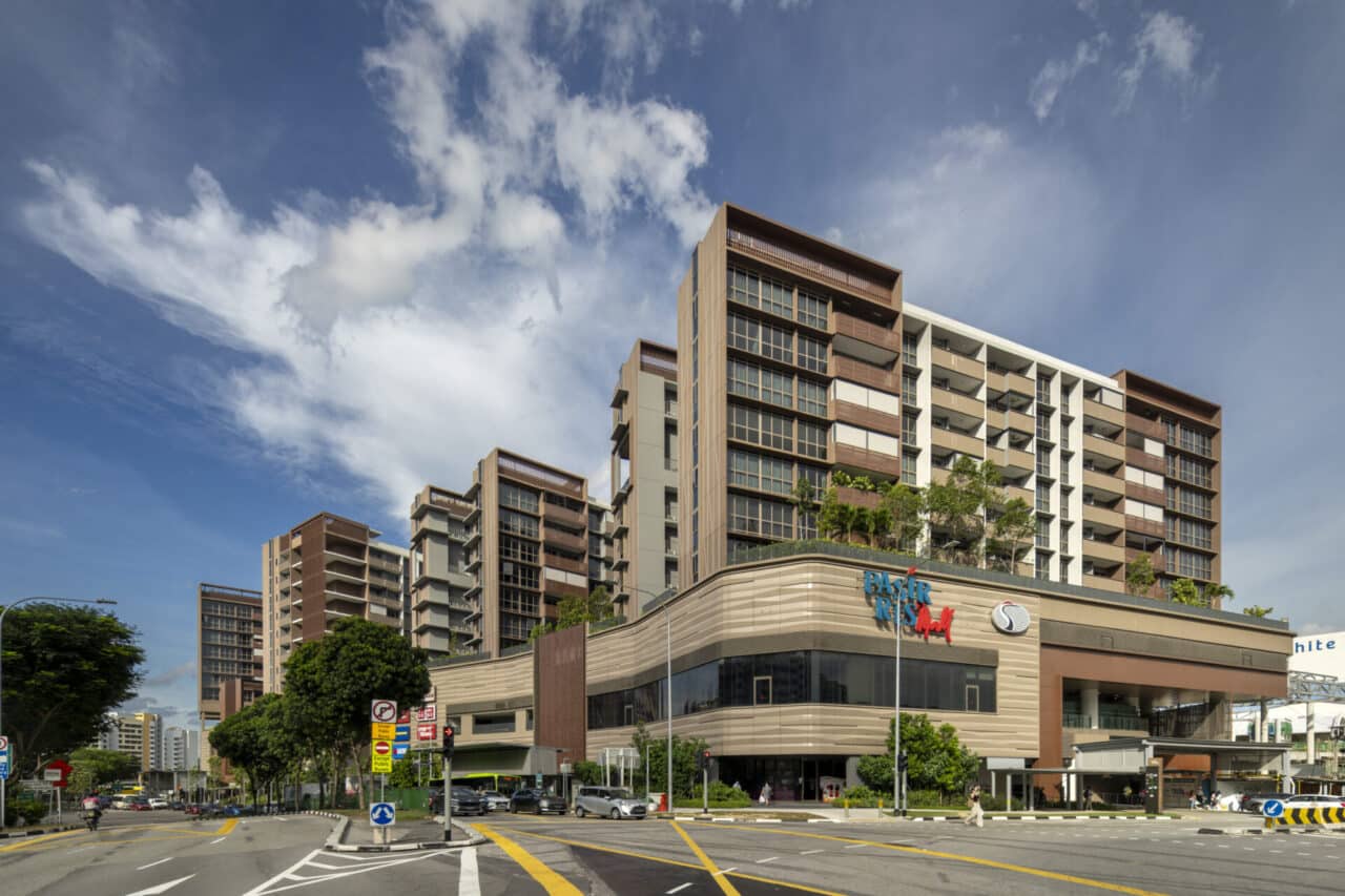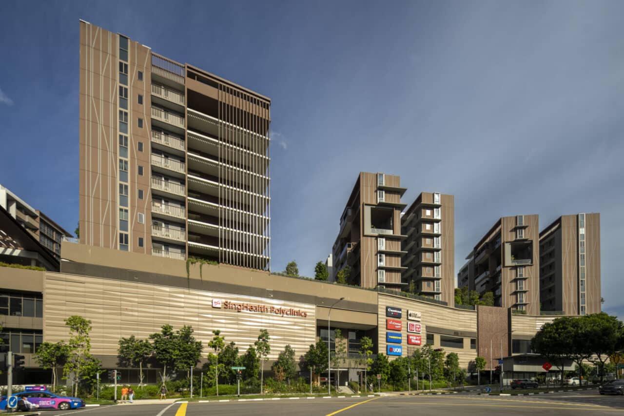 The mixed-use development is made up of 7 blocks of residential apartments (487 units), 2 basements for carpark and commercial use, underground linkway to MRT station and a 4-storey podium comprising bus interchange, HDB town plaza, polyclinic and childcare centre.